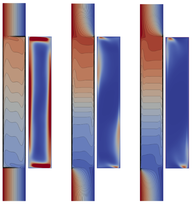 First, we investigate heat transfer in a differentially heated cavity with an aspect ratio of 1/4, where the horizontal walls are modeled using conjugate heat transfer. Direct numerical simulations are performed at a Rayleigh number of 2x109 using a spectral collocation method and an influence-matrix method to ensure the continuity between solid and fluid.