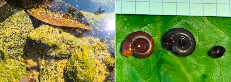 Dans une région endémique, le geste le plus sûr est d’éviter tout contact avec les eaux douces potentiellement contaminées. À gauche, on observe au moins huit mollusques Biomphalaria dans une lagune endémique au Brésil. Sur la photo à droite, de gauche à droite : un spécimen de Biomphalaria glabrata du Brésil, un de Guadeloupe, et un Bulinus truncatus de Corse. Tous proviennent du molluscaire du laboratoire IHPE. Chaque carreau mesure cinq millimètres (Photo : Ronaldo Augusto).